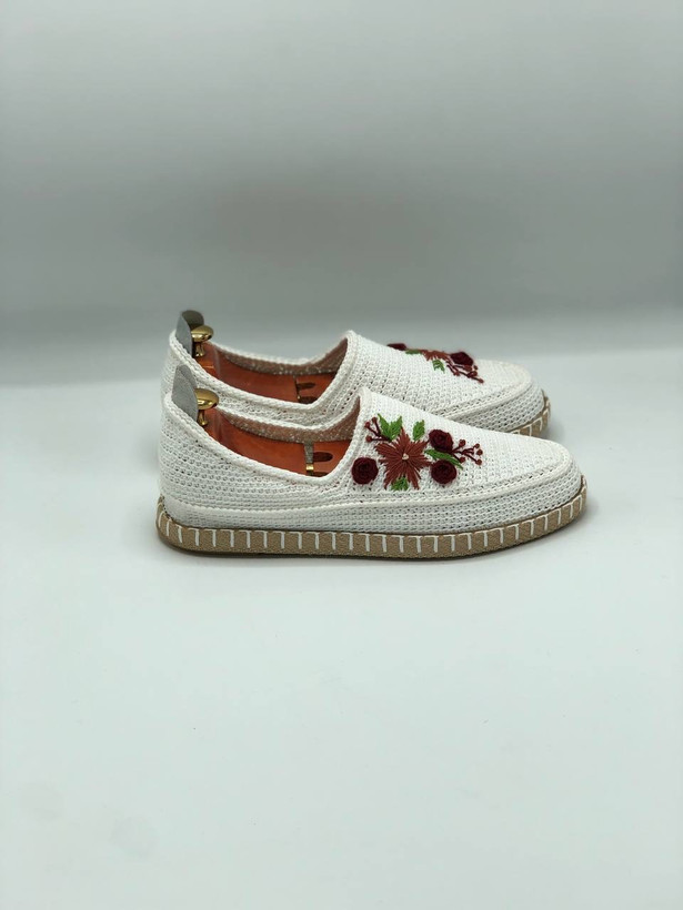 گیوه زنانه سفید با گلدوزیهای زیبای قرمز و قهوهای